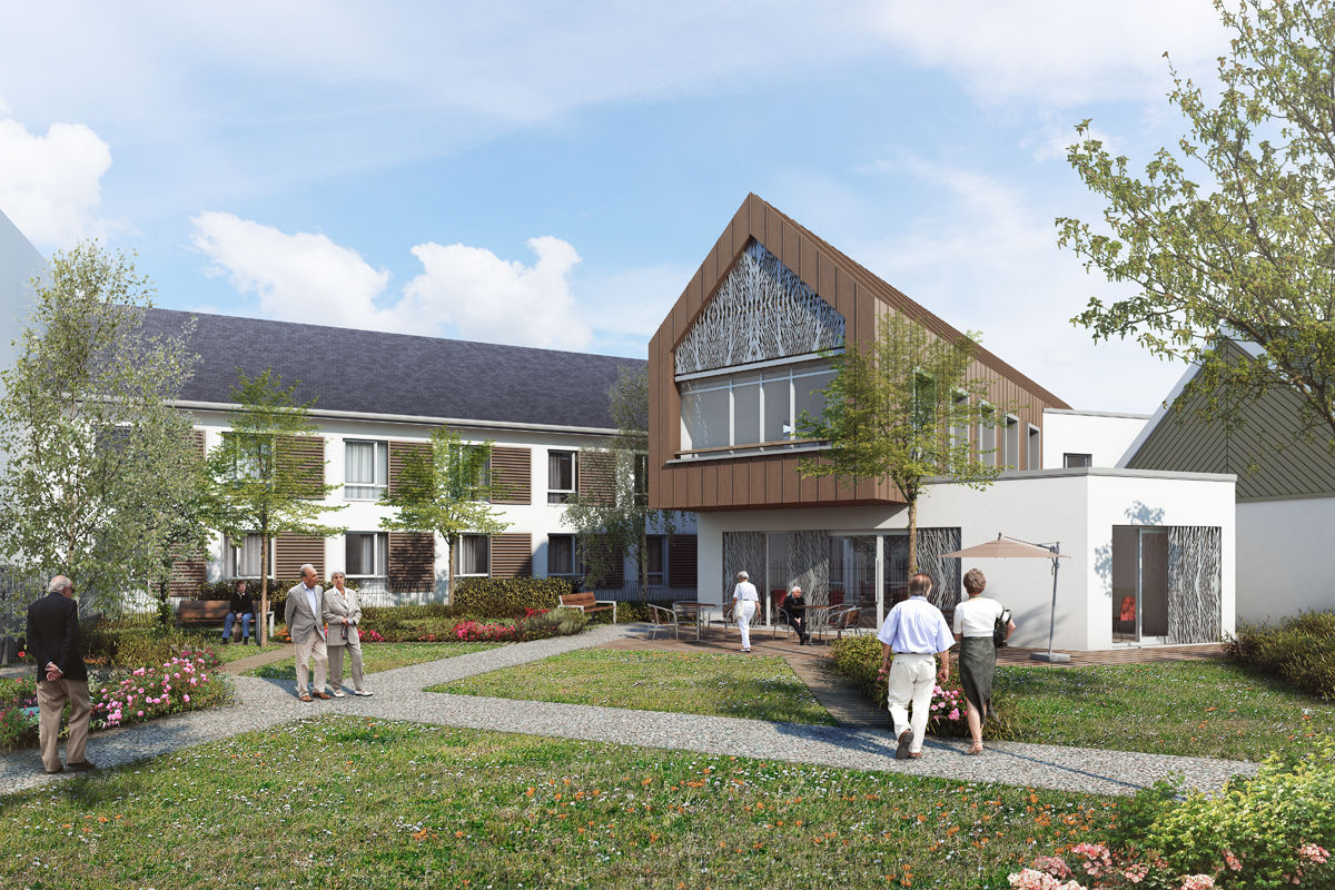 L’extension de l’EHPAD prend en compte son intégration dans le tissu résidentiel et veille à l’harmonie avec l’environnement bâti en présence. Auprès d’un habitat de plain pied ou avec un étage, l’EHPAD et son extension respectent ainsi une volumétrie évocatrice d’une maison traditionnelle, cultivant une image familière et bienveillante pour les résidents.