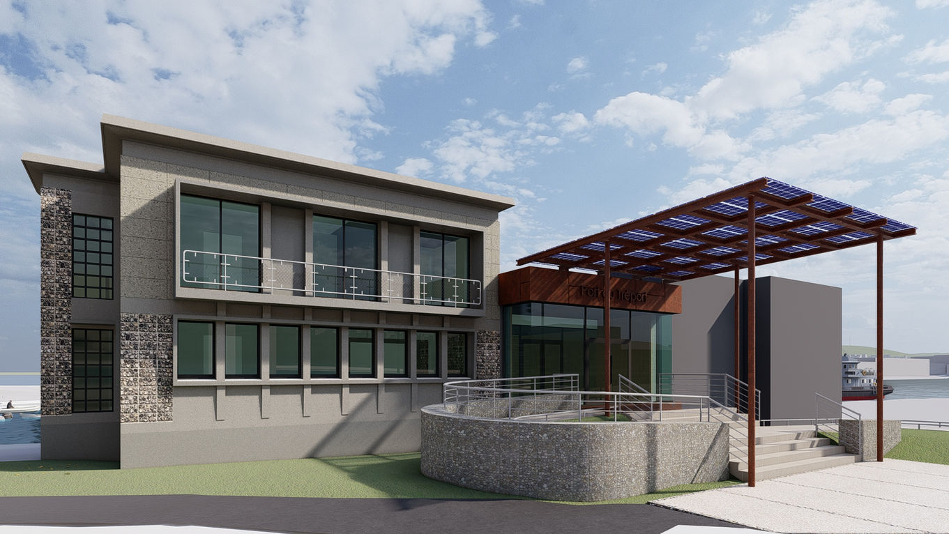 Le projet de construction consiste en la réhabilitation des bureaux des affaires maritimes et du service des douanes et comprend aussi une extension, qui recevra l’entrée principale et la salle du port center. Une partie du bâtiment sera accessible au public. L’extension projetée se glisse entre le bâtiment réhabilité et le bâtiment voisin (hors intervention), en s’alignant sur le rez-de-chaussée surélevé des existants, rendu accessible par une rampe extérieure. Le traitement de l’accès permet d’ancrer cette nouvelle vitrine sur l’activité portuaire, tout en assurant une fonctionnalité inclusive.